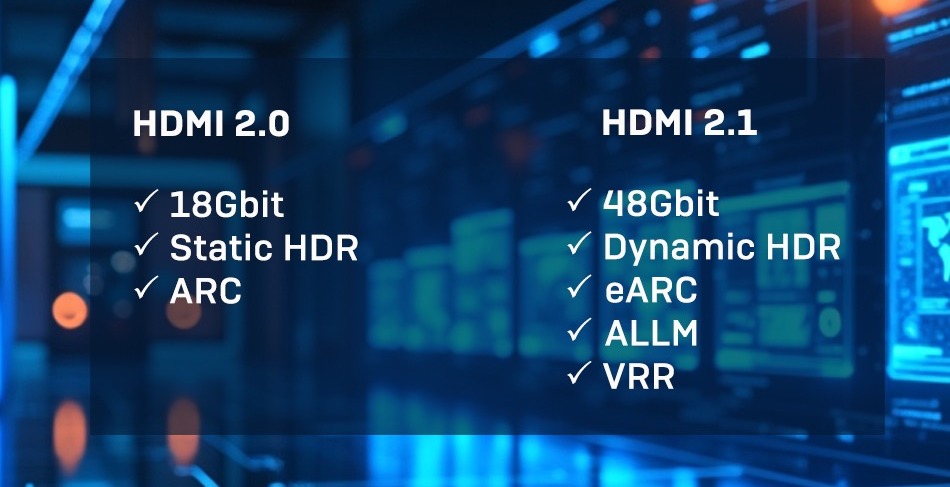 HDMI®2.1 提供更高的頻寬(最高 48Gbps),支援 8K 60Hz 和 4K 120Hz 解析度,並具備可變刷新率(VRR)、增強音訊回傳通道(eARC)以及自動低延遲模式(ALLM)等功能。